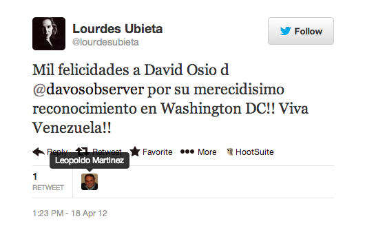 Osío ha abierto su propia fundación en la Florida llamada Davos Financial Foundation for the Development of Economies and Arts (link is external), supuestamente dedicada al arte (pero no está registrada con el fisco Americano como non-profit) y es uno de los financistas detrás de la ONG en Washington DC Centro para el Desarrollo y la Democracia en las Américas (link is external), dirigida por Leopoldo Martínez. Fíjense en el tweet que sigue, lo transparente y jalabolas que es Leopoldo Martínez. Lourdes Ubieta, periodista venezolana le manda un saludo a Osío por un reconocimiento que se compró (que termino siendo chimbo), y en seguida Martínez lo re-envia a sus seguidores: